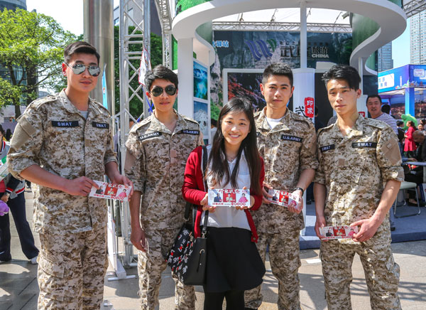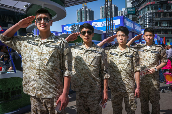 这不,在上周末(4月16日)的2016重庆都市旅游节暨城际旅游交易会(简称“一会一节”)上,四位衣着迷彩服的“宋仲基”一出现便成为所有观众的焦点。现场,他们大摆各种帅气pose,一颦一笑无不动人。“一会一节的颜值水平,被他们至少拉升了8个等级吧!”一位女观众调侃着说道。