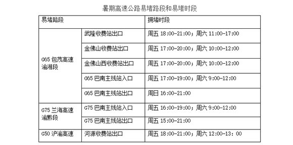 我市暑期热门出游地主要集中在渝东南、渝东北及贵州桐梓、习水等地,因此G65包茂高速渝湘段、G75兰海高速渝黔段、G50S沪渝南线3条高速路车流量较大,暑期周末易发生拥堵。