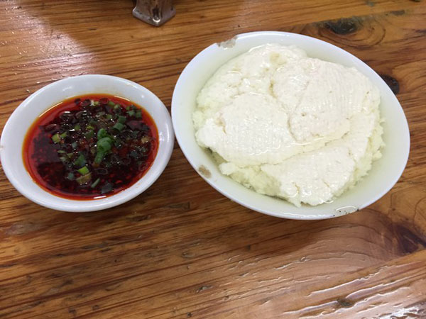 观音桥峨眉仙山豆腐脑,用黄豆磨浆制成,食用时加熟鸡丝和各种调料。特色是麻辣鲜香,入口而化,风味别致。
