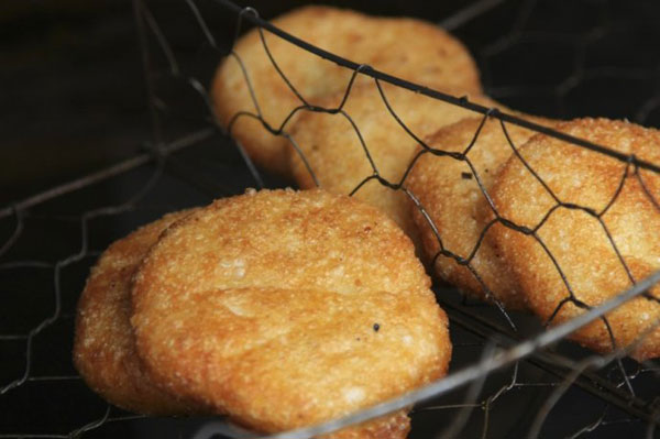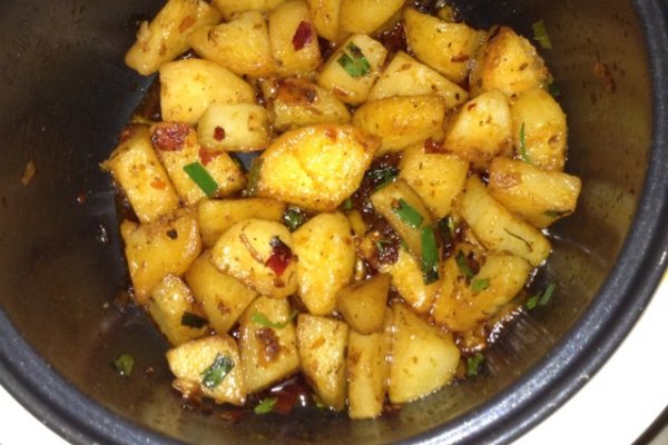把洋芋(马铃薯)去皮煮熟后,放在油锅中煎炸,待黄亮熟透后从油锅中捞出,当然,如果有黄橙橙的锅巴更好。稍凉一会,待变脆后,撤上用辣椒面、花椒粉、精盐等配制的调味品即可食用。