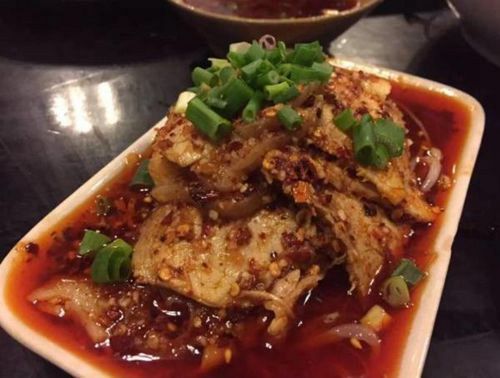 凉拌肥肠,那口感叫一个安逸,首先,肥肠洗得很干净,用的全是肥肠头,打底的是葱段;再者,调料配得很不错,麻、辣、鲜、香,特别是那个自制的辣椒油,香惨了!