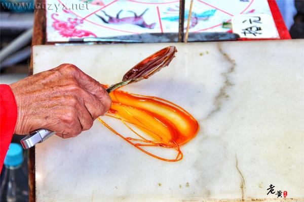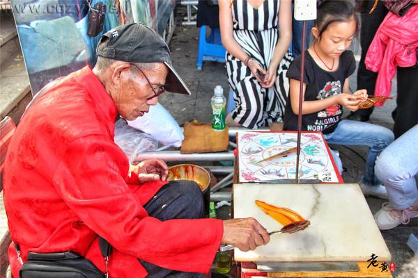 进园内,首先触动我的是一名做糖关刀的老艺人。我不知道目前的小孩是怎么看待这道既是美食又是艺术品的玩意,但至少退回去20多年,糖关刀绝对是童年难以磨灭的情怀。记得,读书时,每天有那么2角钱的零用钱,放学后要嘛是哄聚一起,吃绞绞糖!要嘛就是围在糖关刀师傅周围,看他制作各种各样好玩的造型糖人。有时经过反复的思想斗争,不舍的摸出钱来,跑到转盘旁,祈祷自己能抽到龙或者鱼这样的“大件”,虽然每次的结果都差强人意,但那种情怀却是一种成长足迹。看着老艺人已满是皱纹的手,在他勺下妙笔生花。而现在随着时代的更替,越来越多的高科技取代了民间艺术,这糖关刀不知道还能维系几代人呢?想来唏嘘!不过看到拿过糖人的孩子,满意的笑容,这也许就是对糖关刀这门艺术以及老艺人最完美的回馈吧!