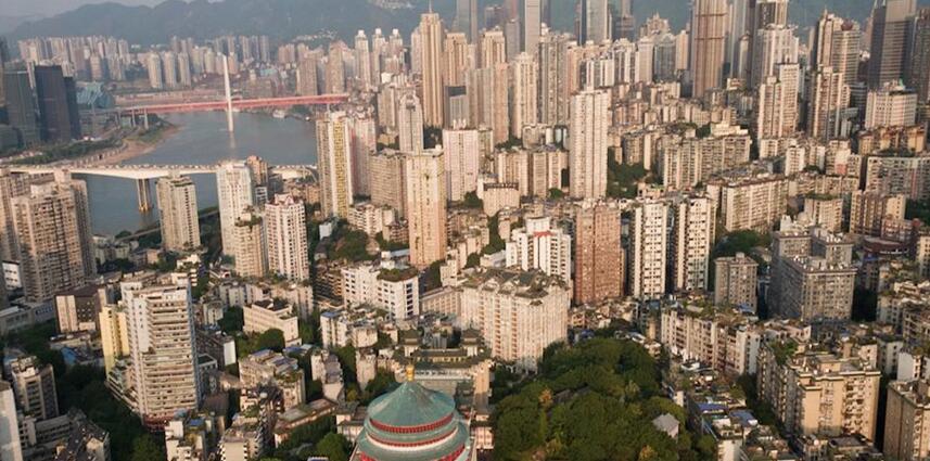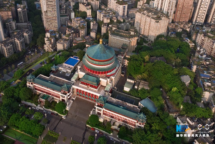2006年,重庆人民大礼堂经历了有史以来最大的一次修复。大礼堂在岁月的洗礼下,一直见证着重庆这座城市的历史与发展,始终庄严、肃穆,散发着历久弥新之美。图为俯瞰重庆人民大礼堂,周围的建筑历经岁月变迁,如今已高楼林立,大礼堂却始终沉稳地掩映在树丛之中。