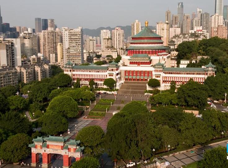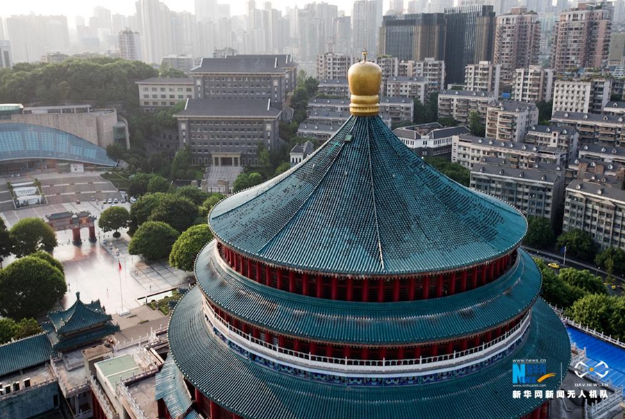 新中国成立后,当时的建设者们决定在重庆建造一座大礼堂,著名建筑师张家德担任大礼堂的设计师,礼堂主体融天坛祈年殿和天安门城楼特点于一体,再配以两翼廊道和塔楼,以明清建筑风格的路线,展现整体建筑的典雅大方。图为航拍重庆人民大礼堂,大礼堂气势雄伟,是中国传统宫殿建筑风格与西方建筑的大跨度结构巧妙结合的杰作。