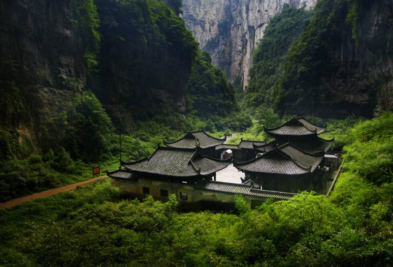 当年摄制组花了500万人民币搭建这个坐落在武隆天坑底部的天福官驿,电影中那些从绝壁上纵身跃下的黑衣侠士,打斗于这雄伟险峻的天坑中,场面何其壮观。