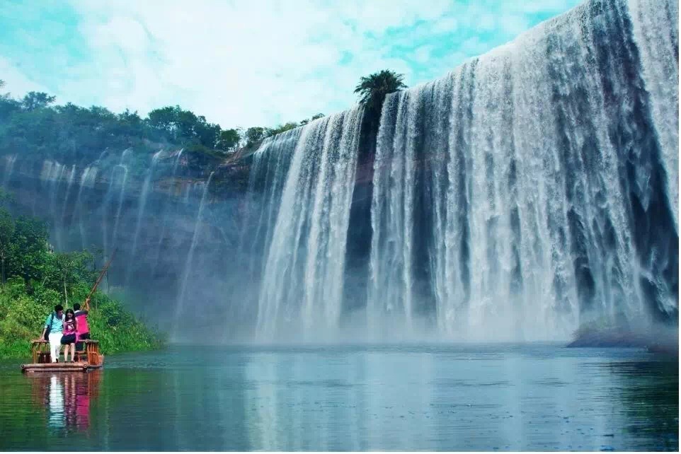 云雾温卷,在阳光的照射下瀑雾处处成虹