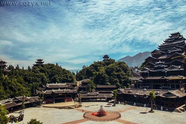 蚩尤九黎城位于重庆彭水县乌江左岸,占地30公顷,总建筑面积59680平方米,是国内最大的苗族传统建筑群。蚩尤九黎城是彭水自然风光与苗族历史文化的有机结合体,景区融入了原生的苗族、土家族文化,完全建成后将根据真人、真物、真产业的特点,让众多的苗家、土家文化传承人在这里表演绝活,如上刀山、下火海;如斗牛、赛马以及武术表演;如古老的冷兵器展览等。