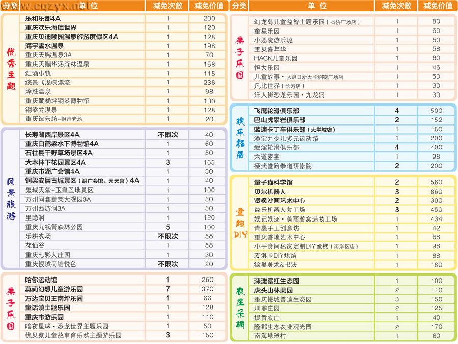 《2016-2017重庆亲子年票》收录的景区景点分为六大类,分别为:分为优秀主题类、风景旅游类、亲子乐园类、童趣DIY类,欢乐拓展类,农庄采摘类。